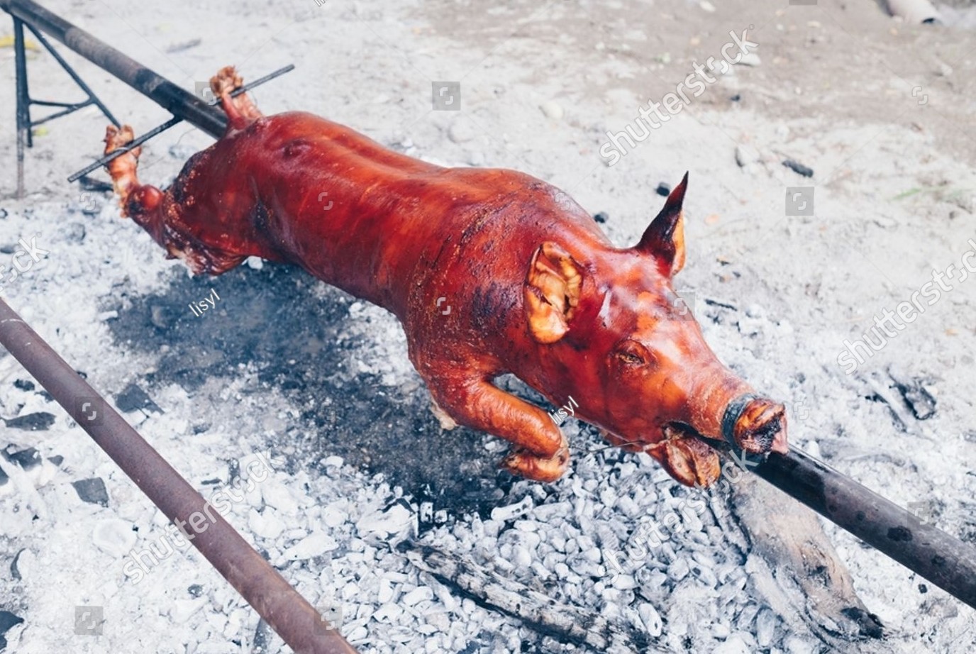 お祭りには欠かせない豚の丸焼き。炭火でじっくり中まで火を通す、手間のかかる料理です。